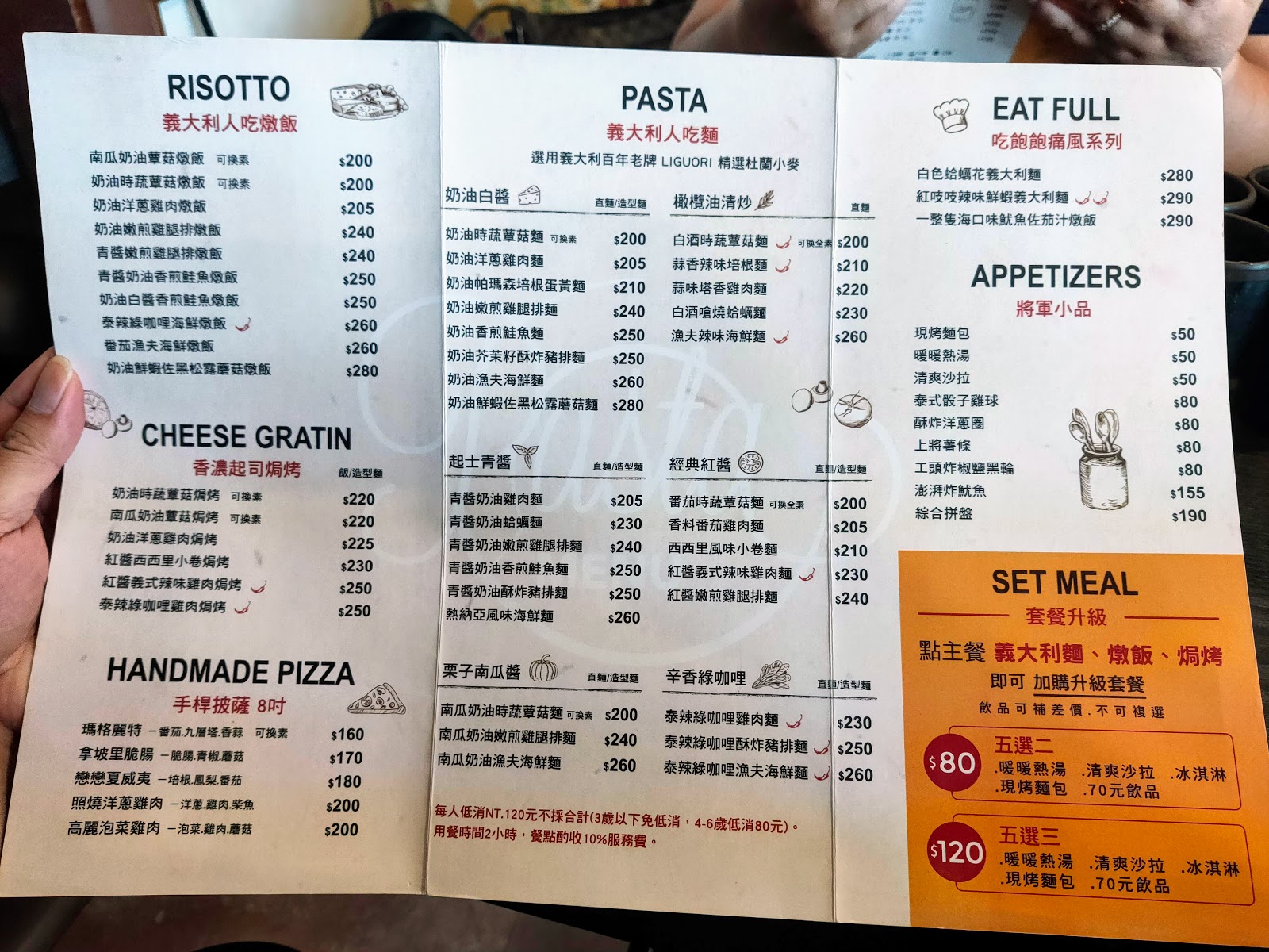 提供的料理有義式料理的義大利麵跟燉飯、焗烤類料理、披薩、鍋物、炸物、咖啡與飲料。